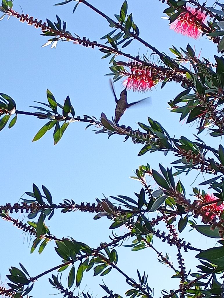 A photo of a hummingbird and a bottle brush plant, October 19th, 2025, Berkeley, CA
