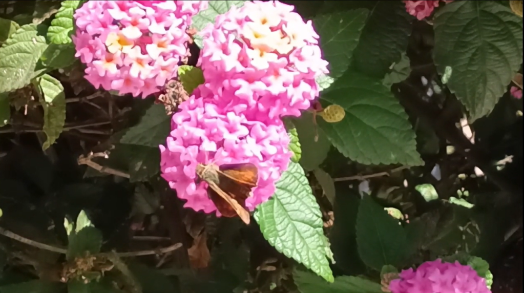 There was a bush (or a cluster of them) with yellow and pink flowers, which seemed to be very popular with small brown and quick butterflies. I had seen them occasionally around, but their numbers had been increasing towards autumn. They look like online photos of skippers, which are common in California and North America, and though I would not presume to identify the exact species with 100% certainty, an Umber Skipper or a Fiery Skipper seems a possibility.