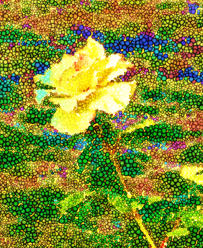 This is a color saturated bubbles rendering of a close up view of tree bark I photographed this month (August 3rd) in Berkeley. Unfortunately, I have forgotten which tree.