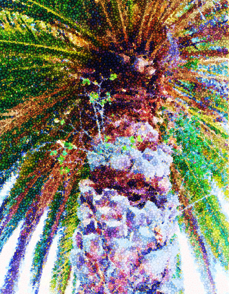 This is a mosaic bubbles version of a photomodification of a palm top and an epiphyte growing on it, also from jul10 folder, photographed in Berkeley.